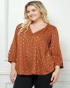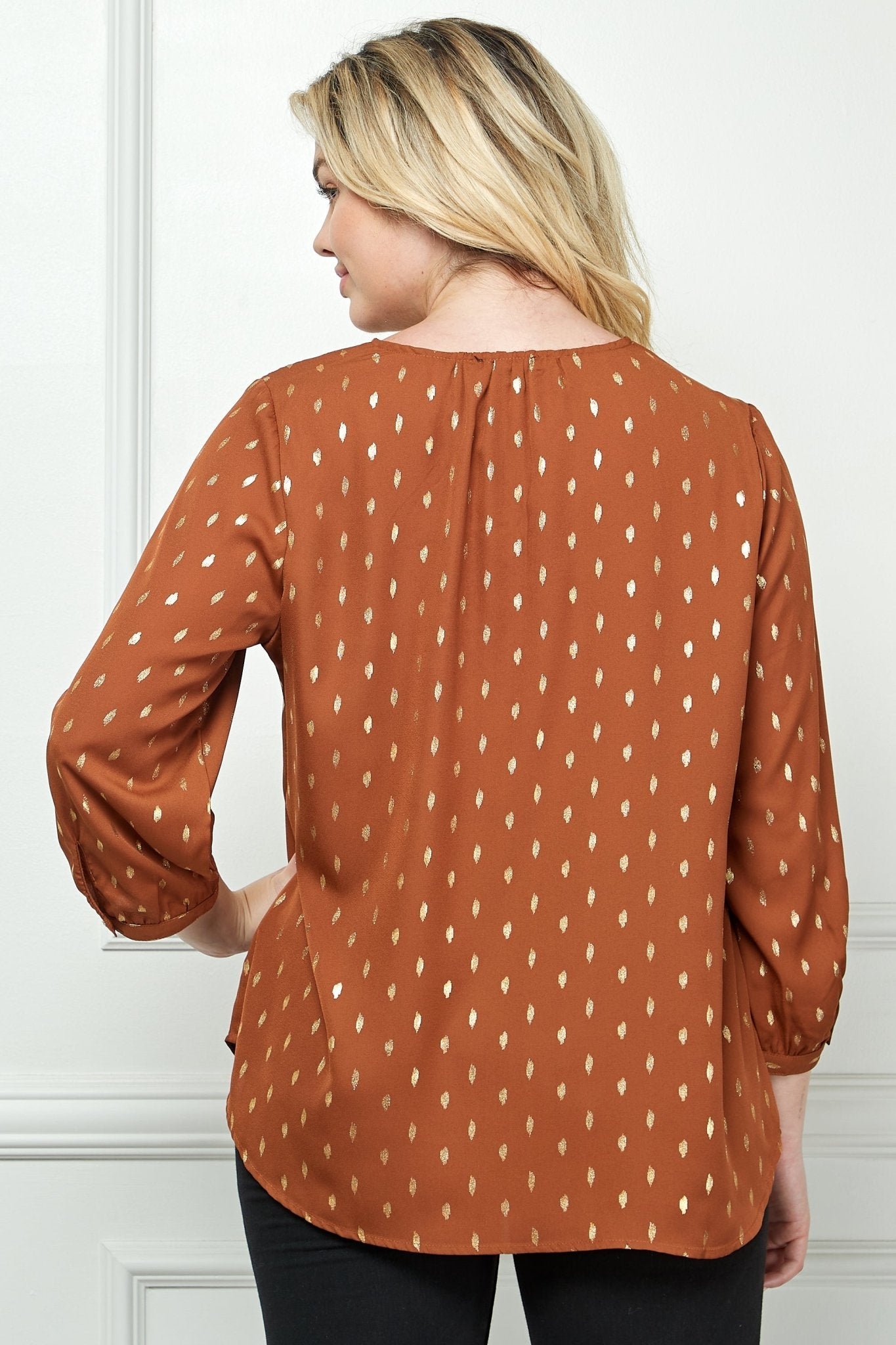 Add a hint of shimmer to your look with this metallic dot V-neck blouse. Featuring three-quarter sleeves with button-tab details and a relaxed silhouette, this top effortlessly combines style and comfort. Perfect for day-to-night transitions or casual chic outfits.Shimmering metallic dot pattern for a touch of sparkleFlattering V-neckline with button accentsThree-quarter sleeves with button-tab cuffsLightweight, flowy fabricLength 29 3/4'