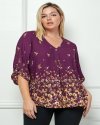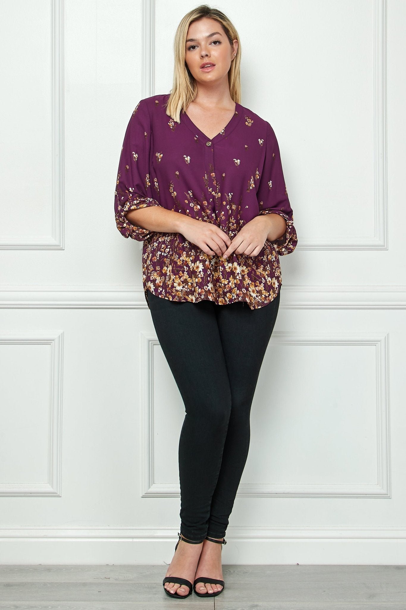 A perfect blend of comfort and style, this floral print blouse features a flattering V-neckline and button details. The rolled-up sleeves add a touch of casual charm, while the soft floral design keeps it fresh and feminine. Ideal for any day of the week!V-neckline with button accents for added styleRolled-up sleeves with button tab closureFlattering, flowy silhouette for all-day comfortPerfect for casual outings or a relaxed workday lookLength 29 1/2'