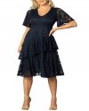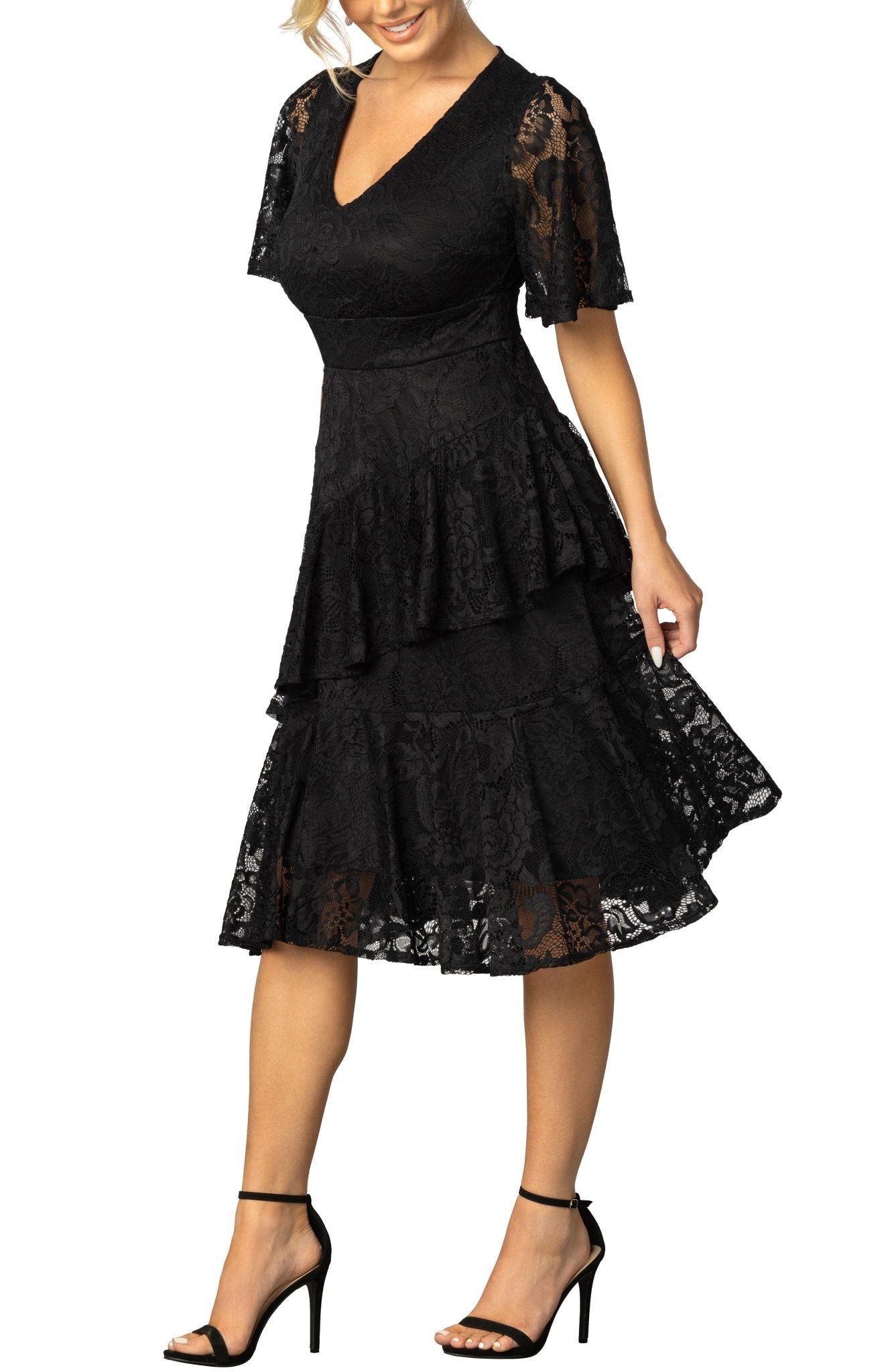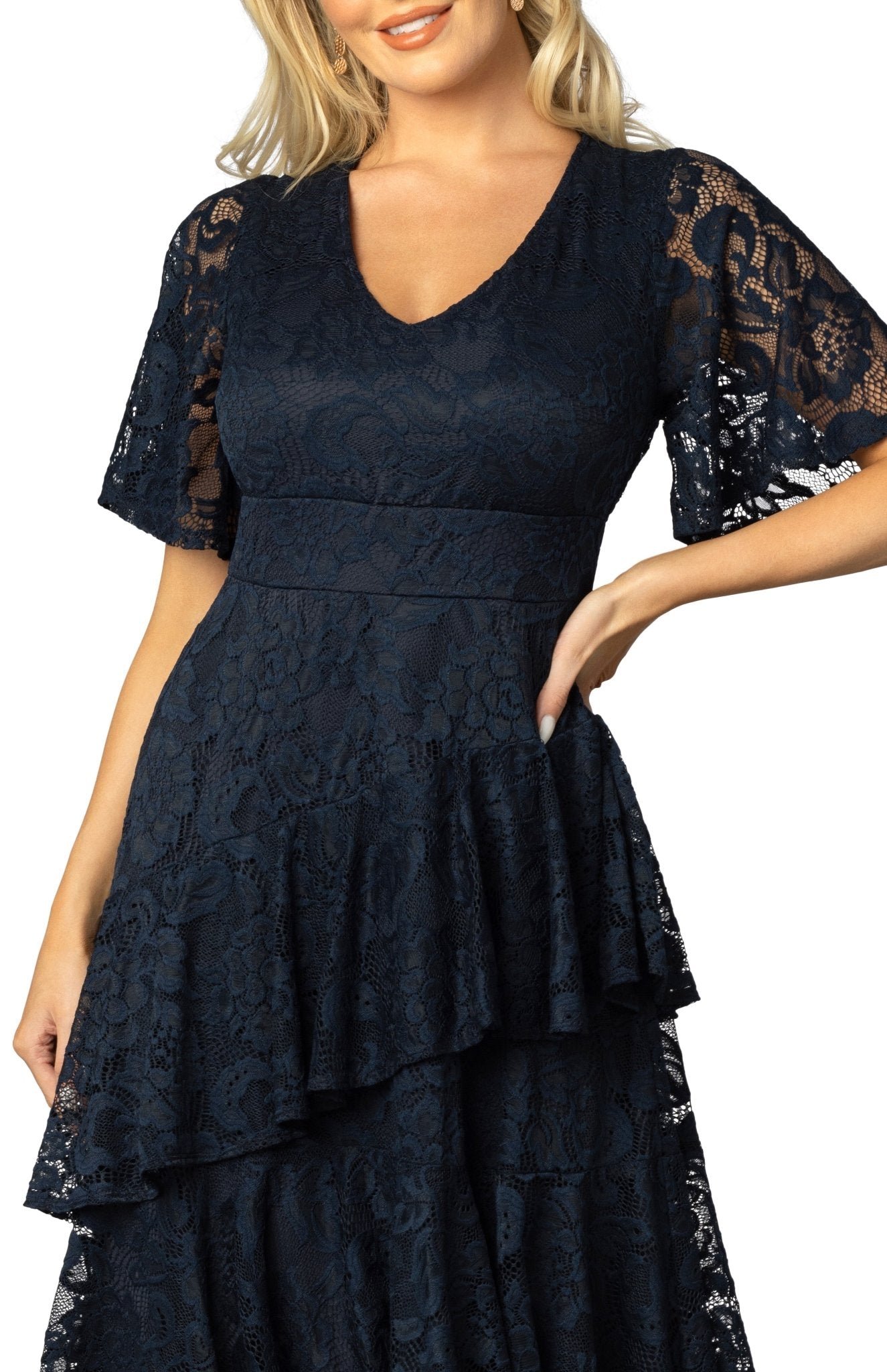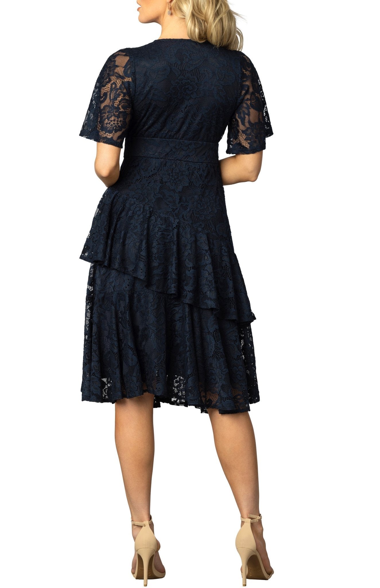 The Lace Affair Cocktail Dress is a stretch-lace special occasion dress with a V-neck bodice, flattering A-line skirt, asymmetrical flounces, and flutter sleeves. Perfect wedding guest and party option. Available in regular and plus sizes.-Material: Self: 90% Nylon, 10% Spandex/Lining: 100% Polyester-Care Instructions: Dry clean only. Do not steam. Cool iron when needed.-Product Fit: Empire waistProduct Specifications:-Soft stretch lace, lined bodice and skirt, pull on style.-Flirty and fun asymmetrical flounces.-V neckline.-Made with love in the USA.