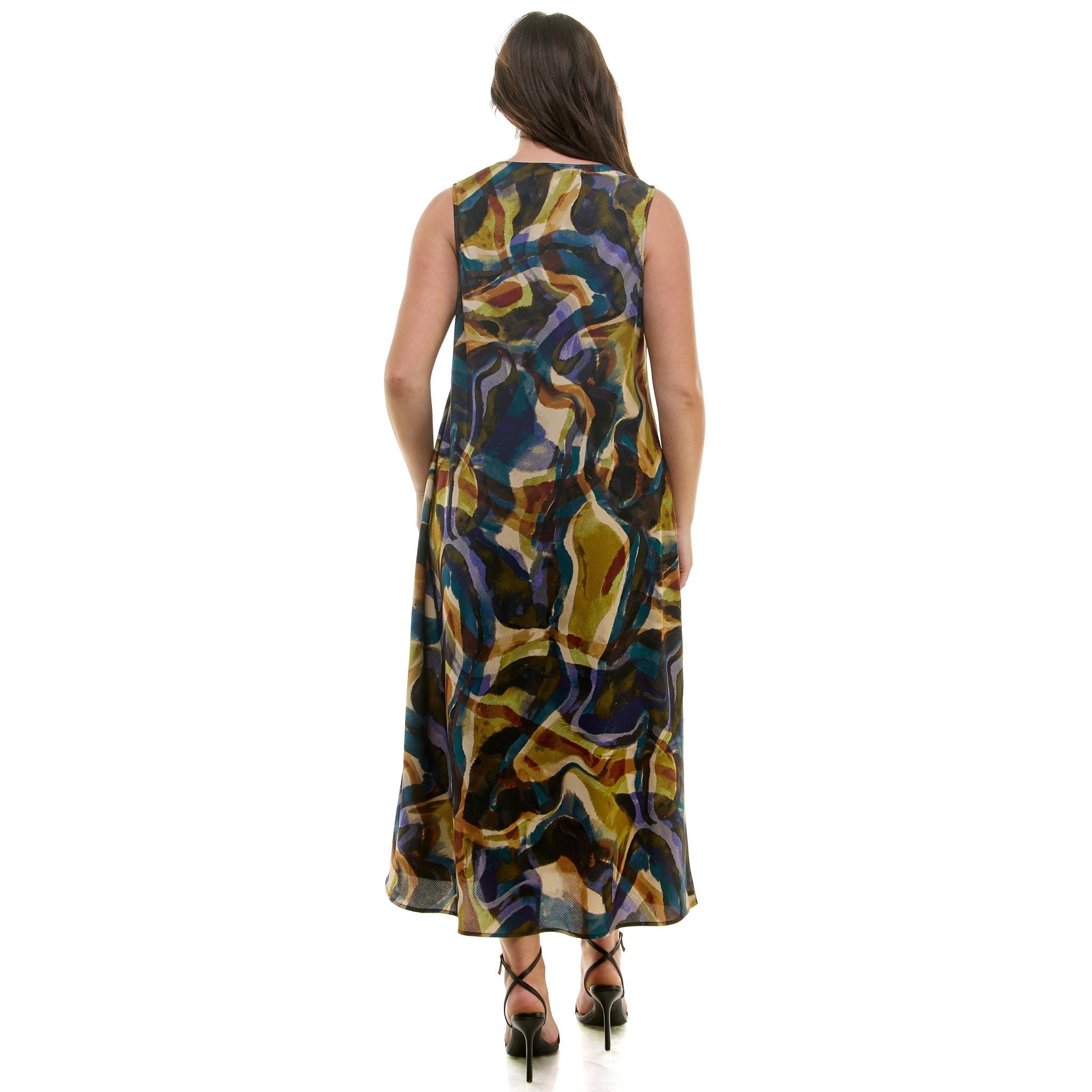 Make a bold impression with this sleeveless swirl print midi dress, featuring vibrant abstract patterns in rich, earthy tones. The dress is designed with a scoop neckline and a relaxed, flowing fit for a comfortable yet stylish look. Perfect for casual outings or special occasions.Eye-catching swirl print in rich colorsSleeveless design for warm-weather comfortMidi length, ideal for casual and semi-formal settingsScoop neckline adds a flattering touchLength 54 3/4'