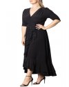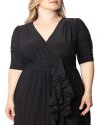 The Veronica Ruffled Evening Gown is an elegant long dress with a faux wrap design, slim 3/4 sleeves, a surplice neckline, and a ruched waistband. The gracefully sweeping skirt features ruffle details from the front waistband down through the hem to complete the look.